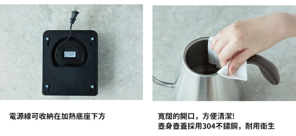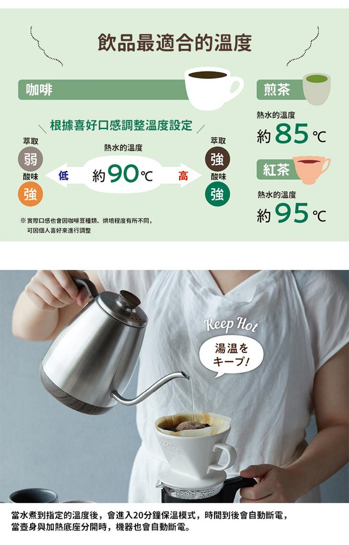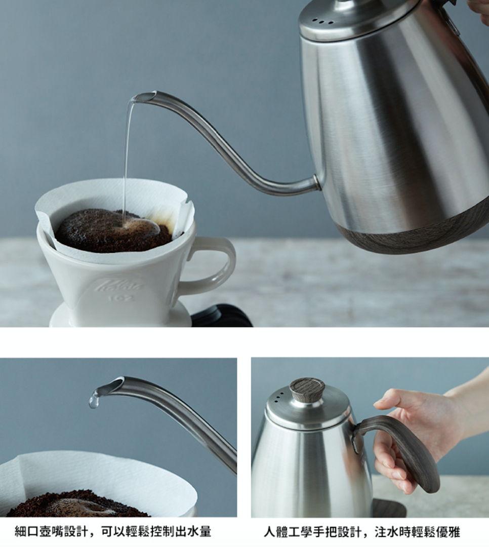 精準溫控,可以精細 ±1°C 調節到想要的溫度,單鍵即可輕鬆沸騰到 100°C;穩度出水的壺嘴與壺把設計,結合工藝與日本職人反覆測試,讓您在沖煮咖啡時注水輕鬆又優雅。