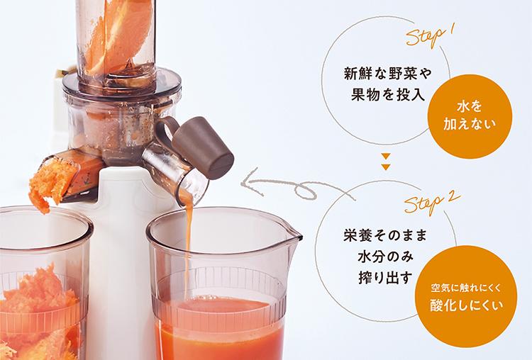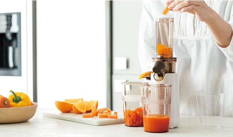 因為採用低速冷壓萃取方式,所以果汁不會暴露在空氣中,因此不易氧化,飲品色澤也很漂亮,同時保留其營養成分,去除纖維、種子和外皮等部分,食材中的膳食纖維,可以用於烹飪或製作其他食品,還可製作美味的冷凍甜品。