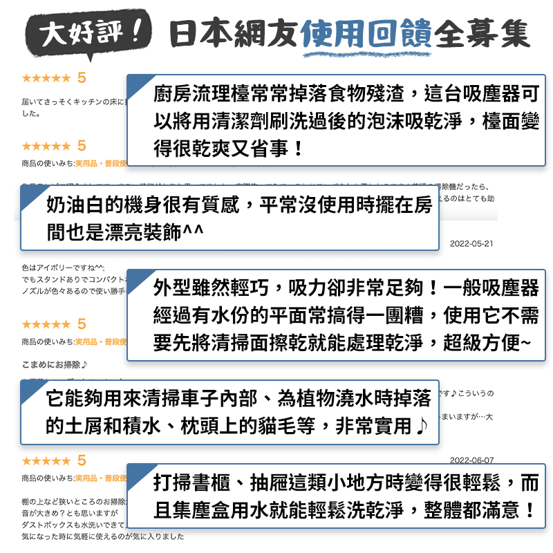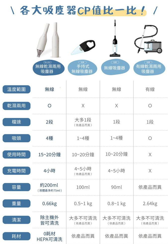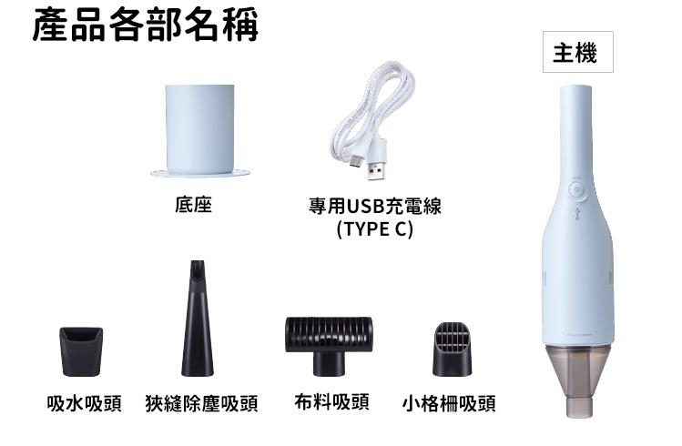 內容物:主機、底座、吸水吸頭、狹縫除塵吸頭、布料吸頭、小格柵吸頭、專用USB 充電線