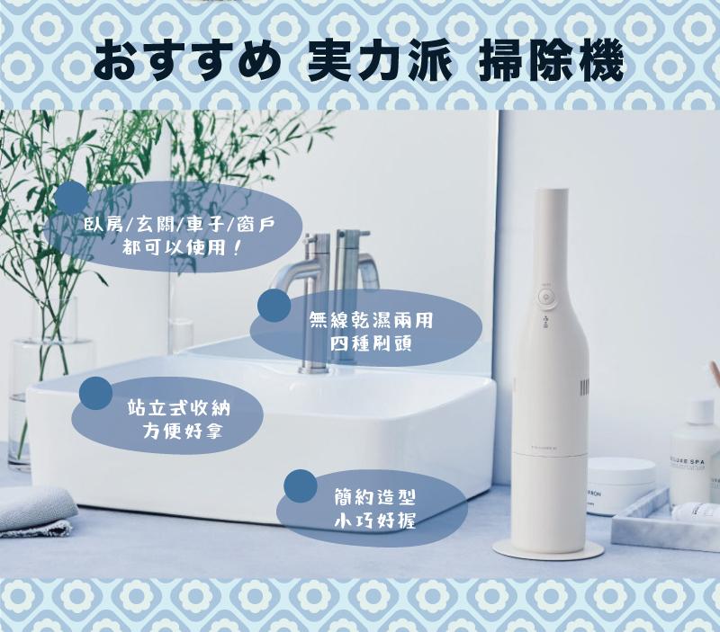簡約時尚,擁有四款刷頭與兩檔吸力,搭載 HEPA 濾網,乾濕兩用也可吸泡沫,握柄輕巧好握,無線使用輕鬆拿取,收納省空間!