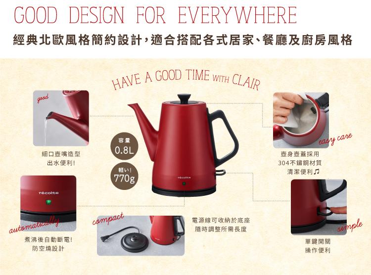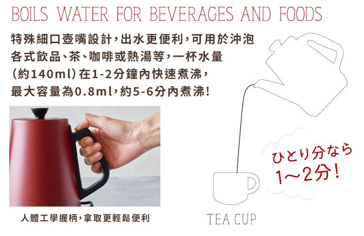 隨時享受一個人優雅品味空間,0.8L 容量, 煮一杯水(140ml)只需 1~2 分鐘,特殊細口壺嘴設計,泡茶、咖啡及各式飲品等,注水輕鬆又優雅。