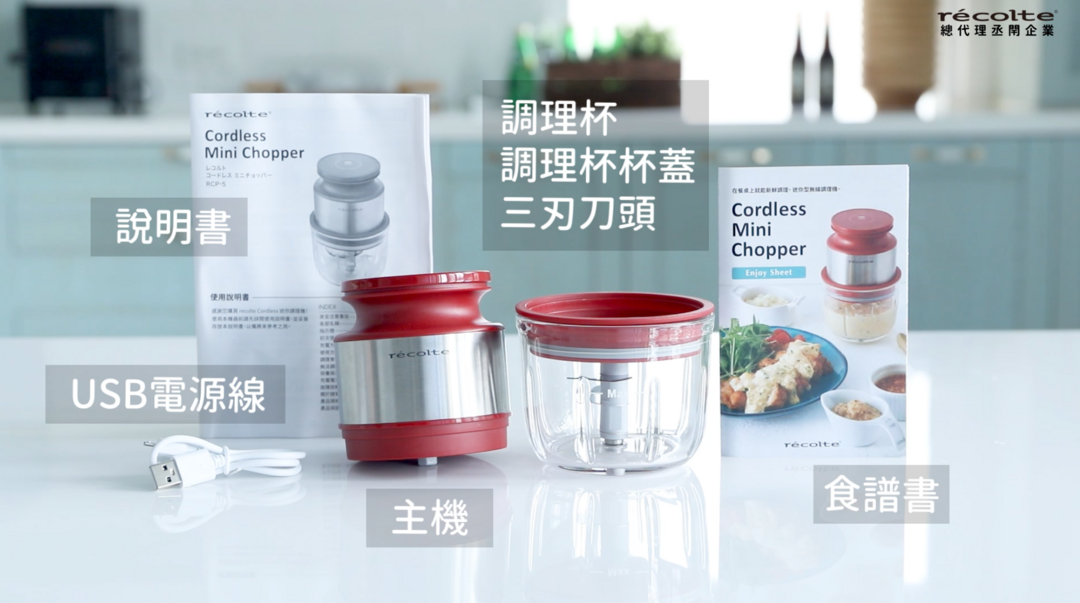 內容物:主機、玻璃調理杯、杯蓋、三刃刀頭、USB充電線、中文操作手冊、商品服務保證卡、7 道精緻食譜
