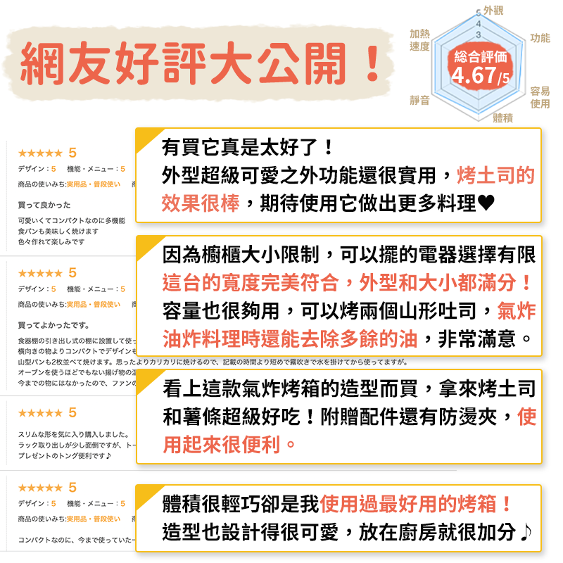隨附專屬烤箱配件,炸籃、烤盤、烤架、防燙夾等讓你在料理過程中做事更有效率!