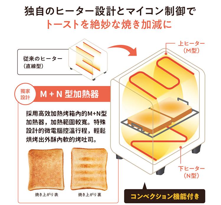 獨家專屬設計,採用 M+N 上下加熱管,比線型加熱器更能保持烤箱內部受熱均勻,適合拿來烤出外酥內軟的吐司。
