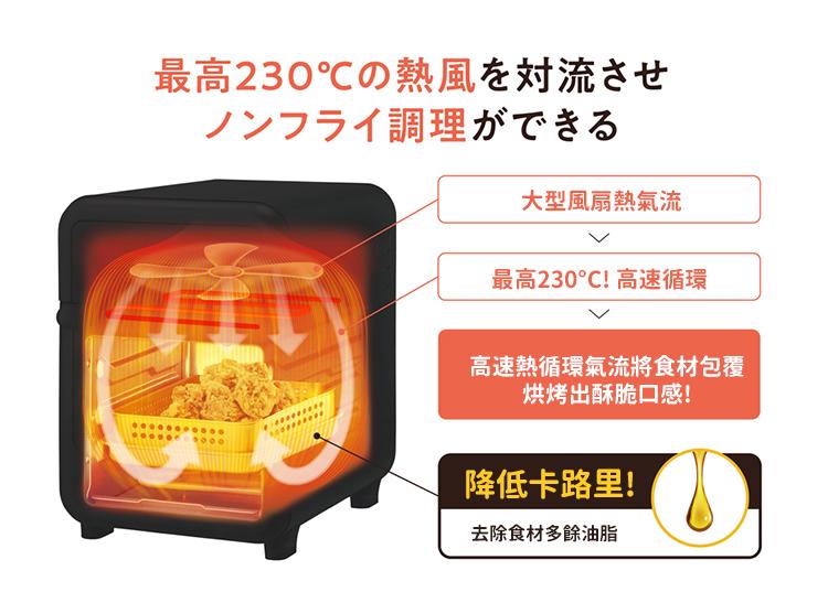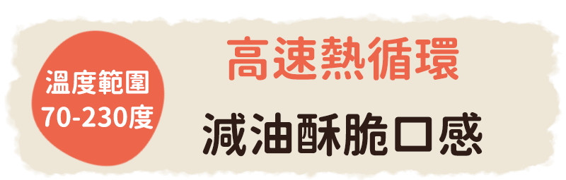 簡單旋鈕設計,烘烤溫度範圍 70~230℃,高速熱循環風扇,可將多餘油質去除,達到食材更健康酥脆的效果。