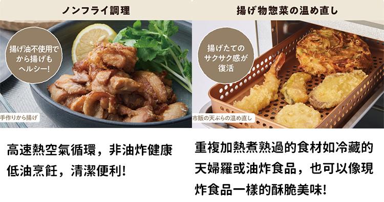 日本熱銷,擁有氣炸、烤土司、慢烤、解凍、果乾等模式,烘烤溫度可自由調節,超廣範圍 70~230℃,還可搭配專屬炸籃、烤架、烤盤等配件,隨附實用配件,搭配變化多種料理,後蓋可拆清潔,方便使用後清潔,貼心集屑盤,兼具美觀實用。