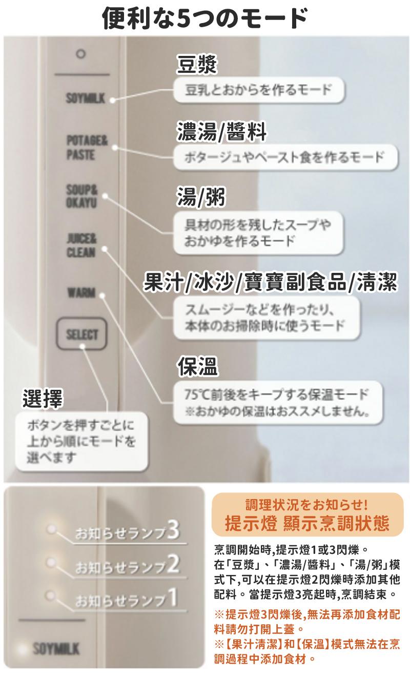 一機十役,五大料理模式擁有豆漿、米糊、濃湯、粥、果汁、奶茶、清洗等模式,可冷榨汁與熱熬煮,精準溫控調節溫度,滿足全方位料理需求。