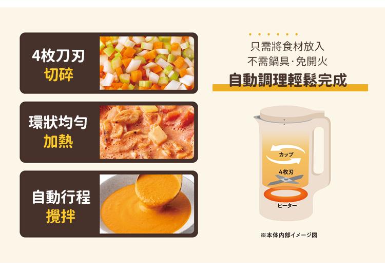 免開火不需要鍋具,一機即可完成切碎、加熱、攪拌等料理程序,自動調理輕鬆完成!