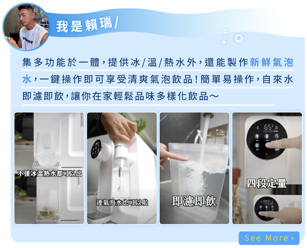 1 機 10 用,喝水不必多道程序,直接取代瓶裝水、淨水器、濾水壺、飲水機、熱水壺、快煮壺、冰水機、溫奶器、氣泡水機等 10 種常見飲水器具,輕鬆滿足一家大小對水的所有需求!