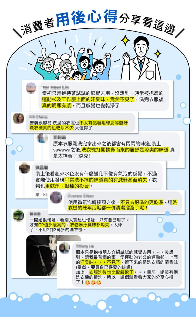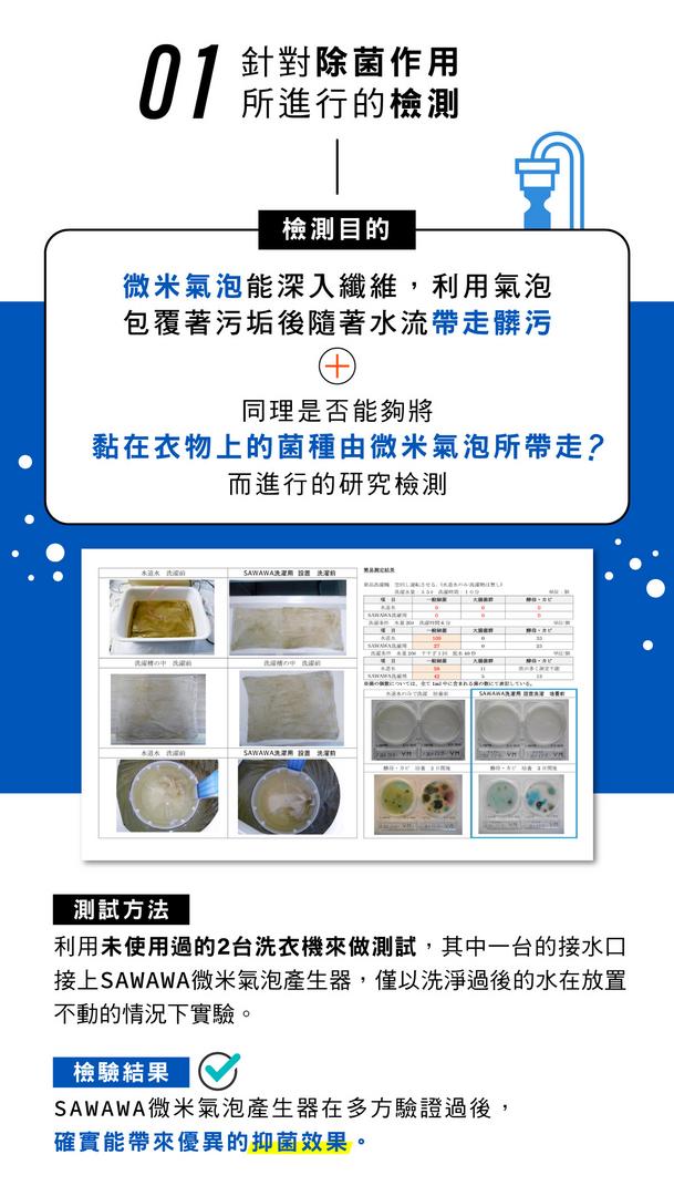 SAWAWA 透過微米氣泡的作用,洗衣槽也能帶來潔淨的效果,當卡在洗衣槽的污垢漸漸沒了後,黴菌、細菌等也就無法繼續殘留在容易被忽略的洗衣槽上了。