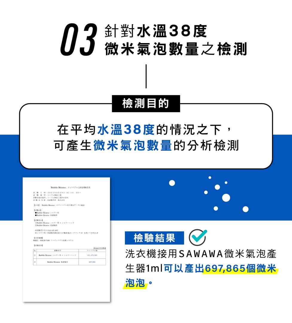 SAWAWA 微米氣泡產生器在 1ml 水量下,可以產出約 60 萬個微米泡泡。