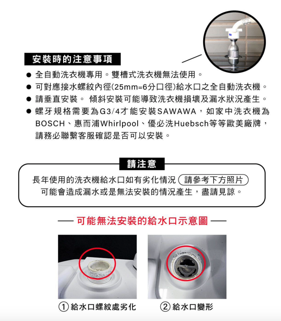 • 很抱歉,由於歐美品牌的洗衣機入水口規格與SAWAWA不符合的情況居多,因此不建議購買本產品。如果欲購買者,請先確認洗衣機是否符合1.入水口徑為24mm~25mm左右的六分口徑 2.螺牙規格為G/34(4/3bsp規格不能使用)的兩項條件。 如果家中的洗衣機為 #BOSCH、#惠而浦Whirlpool、#Huebsch優必洗等歐美品牌, 在安裝前請再次確認以下兩點,以確保能夠使用SAWAWA. (1)入水口徑需要為24mm~25mm左右的六分口徑 (2)螺牙規格需要為G3/4. (4/3bsp規格不能使用) 如發現以上兩點沒有符合,也請避免進行安裝。