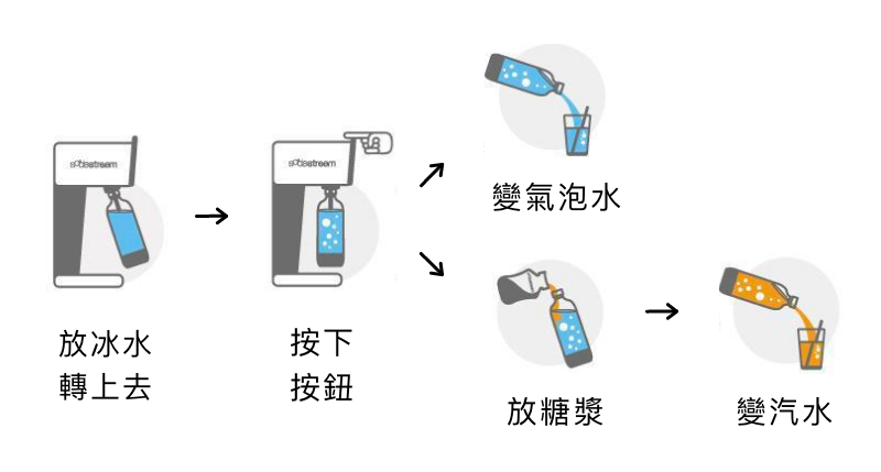 Sodastream 氣泡水機操作超簡單,只要將純水裝入瓶中、旋上機器,按壓上方打氣鈕,沁涼具口感的氣泡水就完成啦!