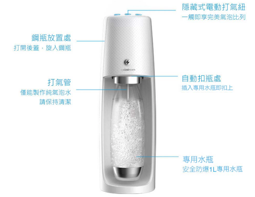 世界最大的氣泡水機品牌 Sodastream 電動式款!操作簡單只要 30 秒,一鍵即享完美氣泡比例,還能加入喜愛的糖漿與,DIY 健康安心的消暑飲品;一支鋼瓶可製作 120 杯市售氣泡水,享用一瓶氣泡水不到五塊,經濟又環保。