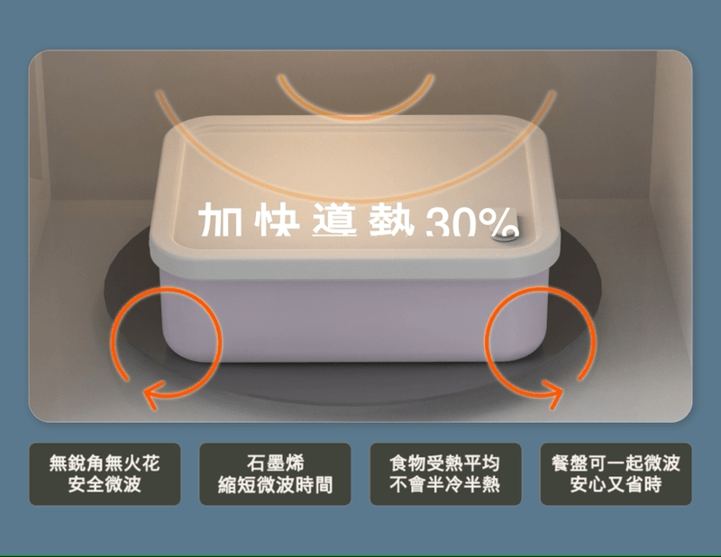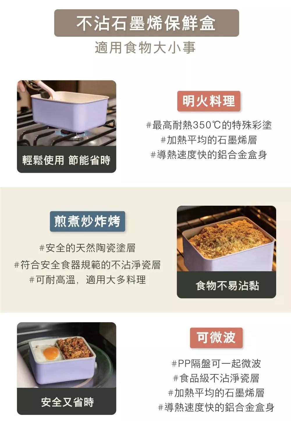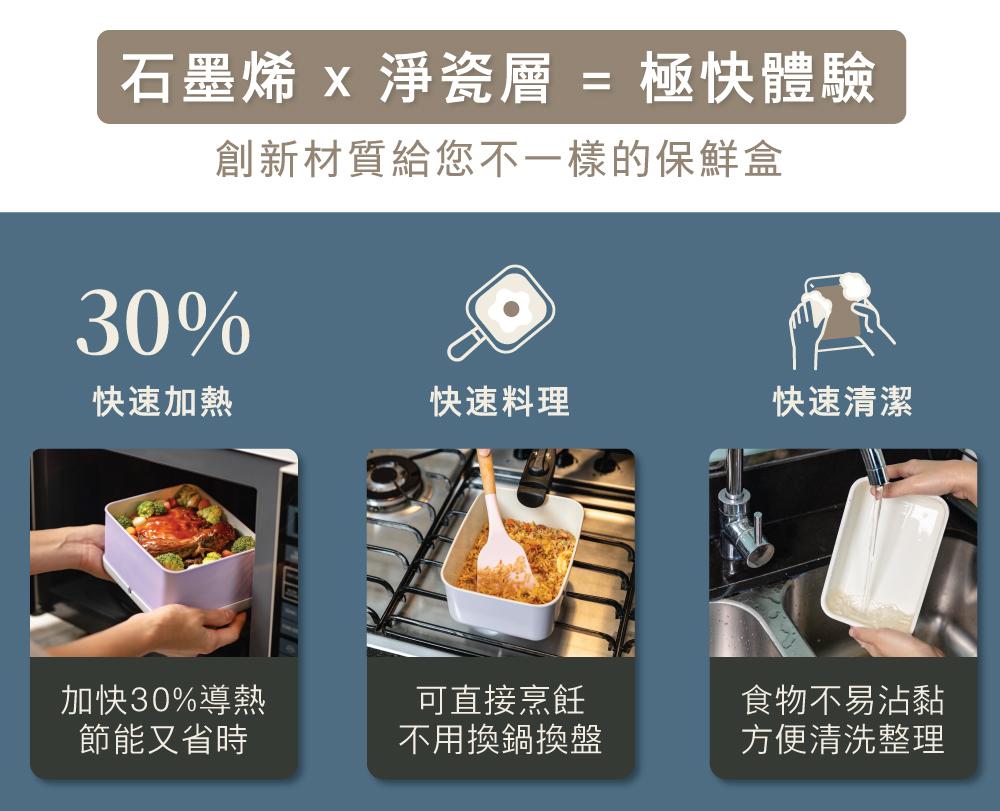透過結合石墨烯與陶瓷塗層不同材質特性,安全無毒的 A+PLUS 淨瓷層,不僅單是保鮮盒,也能直接烹煮食材不沾黏,導熱快速又平均,縮短加熱與覆熱時間,還能安全微波加熱食材,最適合尋找簡單又方便工具,為日常生活準備料理的你。