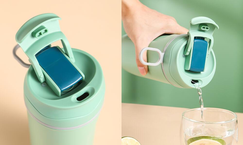 單手開蓋後直接喝,也可以倒到其他杯子喝,特殊飲用口設計,減緩水流速度,避免噴灑。