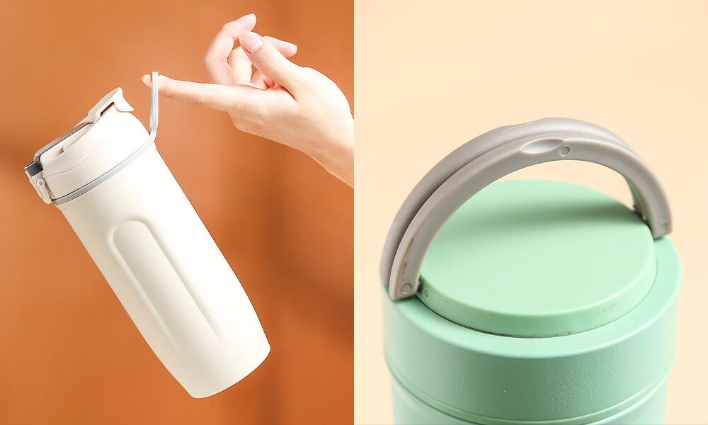 瓷芯杯蓋上附有隱藏式提把,兩用杯蓋則搭配矽膠提把環(可負重 4.5kg),方便提拿動飲杯,陪您到處走