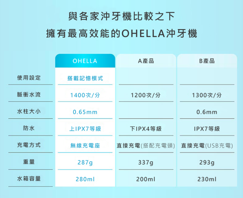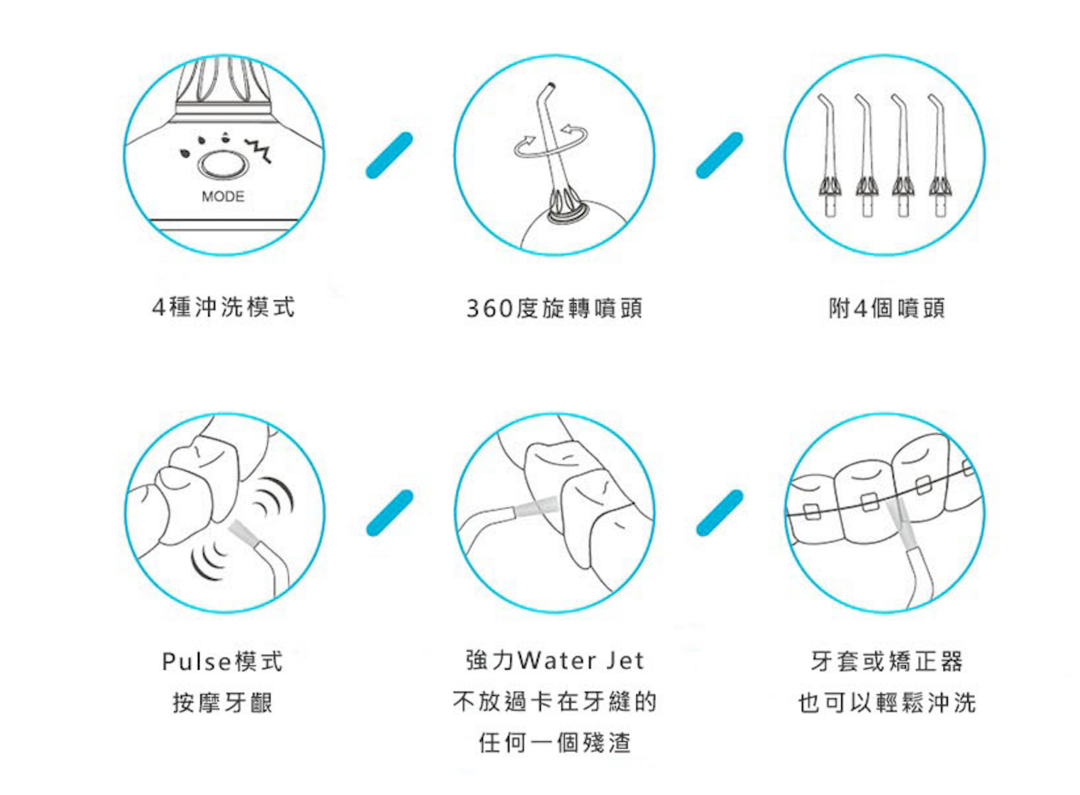 操作簡單且輕量,擁有 280ml 大容量水箱,四種清潔模式自由切換,無線充電更安全,輕鬆呵護個人的牙齒健康;脈衝水流高達 1400次/分,每次的潔牙都能達到最佳效果,溫和清洗模式,讓牙齦敏感的人能放心使用!