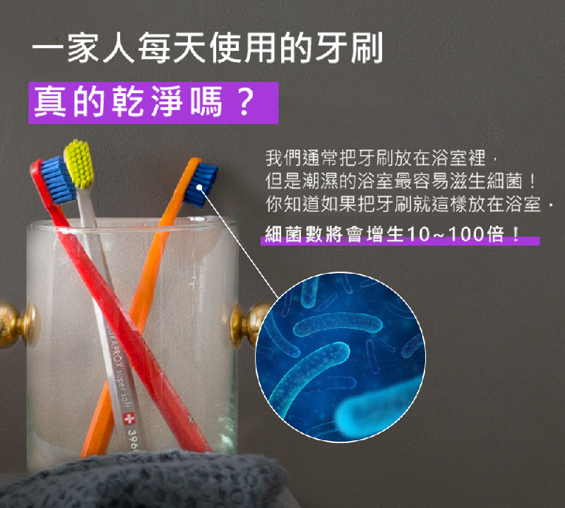 每天早上睜開眼睛,都是以洗漱開始新的一天,既能清新口氣,還可保健牙齒!然而,你知道每天都把牙刷這樣放著,細菌將增生10~100 倍嗎?使用紫外線殺菌能快速破壞牙刷上的細菌,每天都像在使用新牙刷,維持口腔衛生,使用更安心!