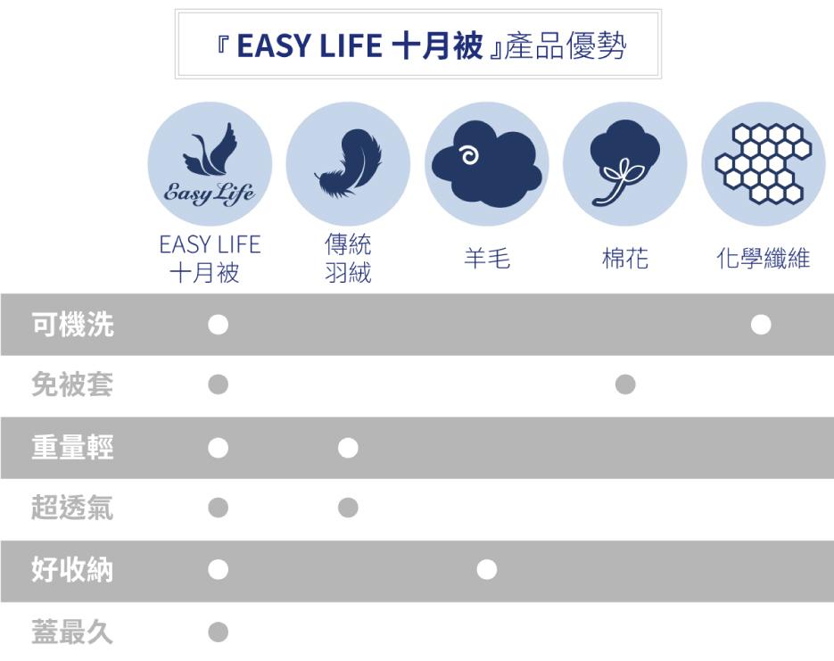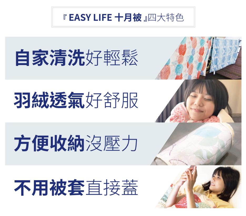 專為台灣氣候設計,適用於台灣 2~11 月,一年中可以讓你蓋十個月的好被子;材質透氣,夏天使用也相當舒服,可直接使用不需被套;方便輕鬆收納,折疊後可小於傳統被子的三分之一。