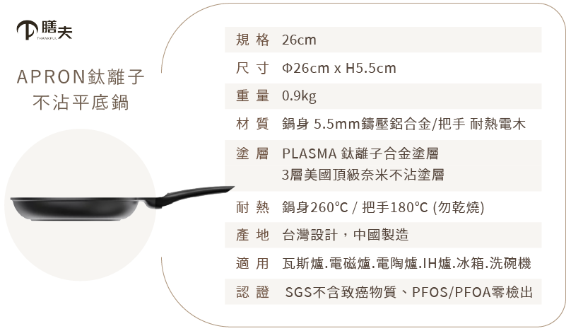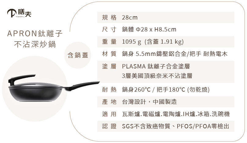 膳夫鍋將航太等級高硬度高熔點,德國 PLASMA 鈦等離子噴附在鋁合金鍋上,產生耐酸鹼極高保護層,耐用度大幅提升,且擁有無致癌 PFOA 合格檢驗。