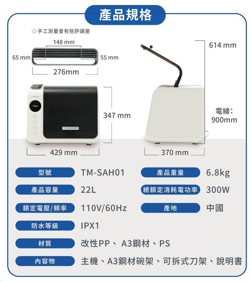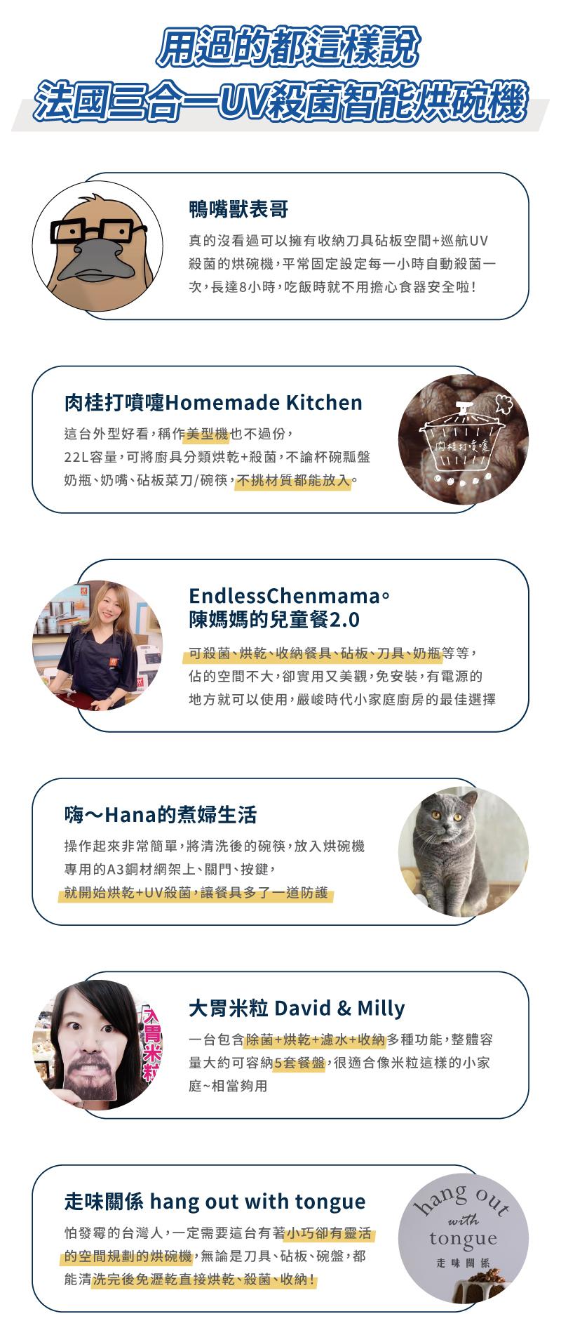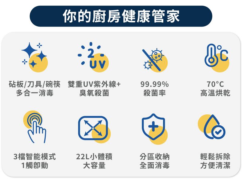 擁有除臭、烘乾、收納多功能的烘乾機,三種智能模式,22L 剛好容量,貼心分區提供砧板、刀具、碗筷等餐具收納,全覆蓋式除菌,符合檢驗認證,殺菌率高達99.99%,配件輕鬆拆除,方便使用後清潔。