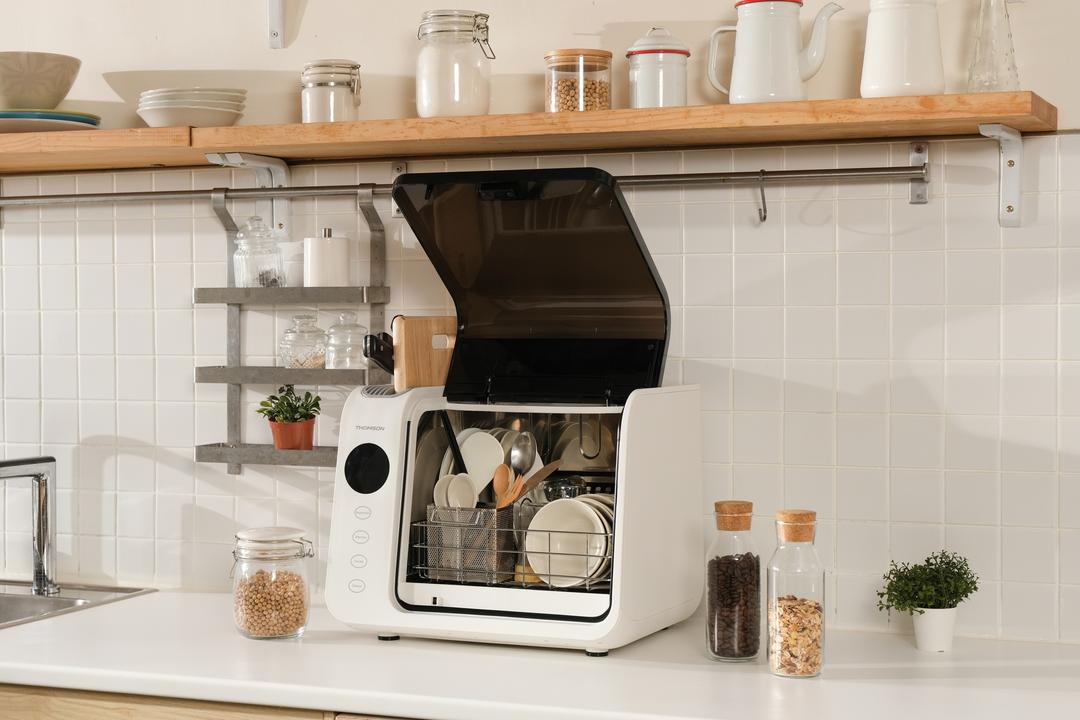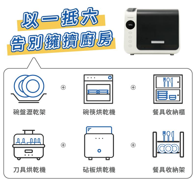 沒有安裝限制,長方形窄型機身,能自由擺放在廚房各個空間,上掀式開門設計,門體可任意角度停留,方便拿取碗盤。