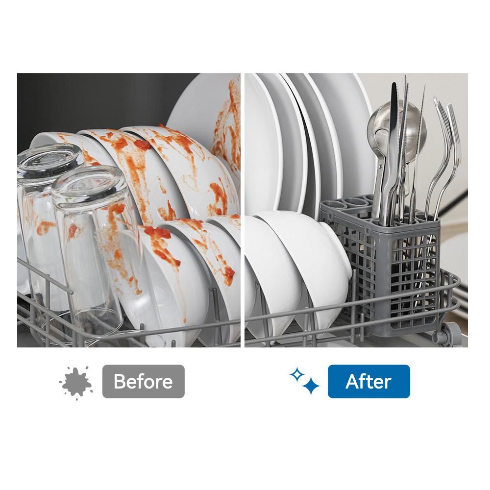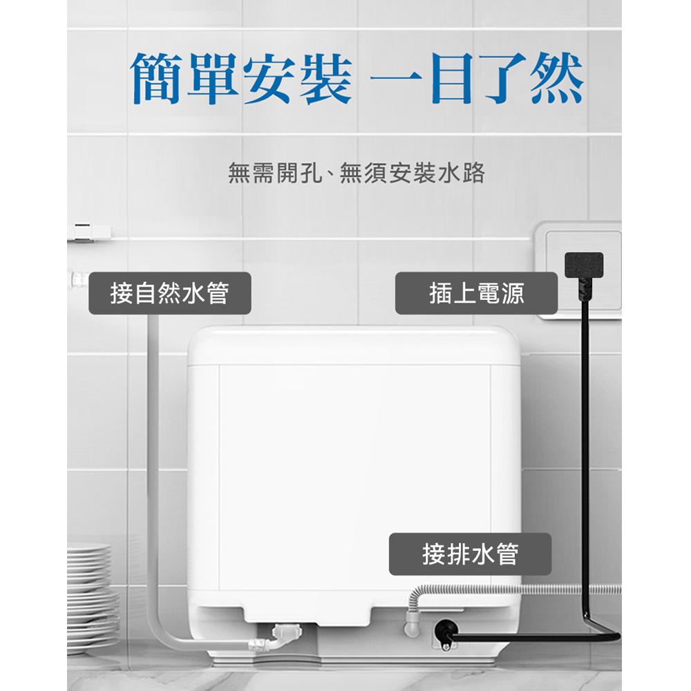 擁有 5 大清潔模式,360 度雙重旋轉噴柱,一機三用,輕鬆完成清洗、烘乾、高溫除菌、自動保管等程序,貼心過濾系統,避免二度污染,小體積大容量,可裝至少 20 件餐具,沒想到小廚房也能有洗碗機!
