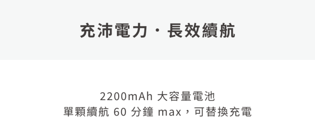 單顆電池容量:2200mAh (最長可使用 60 分鐘)