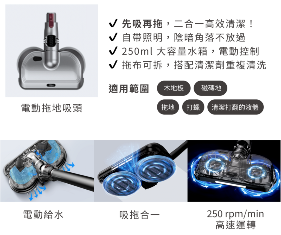 • 25KPA 超強吸力,吸出頑強髒汙灰塵
