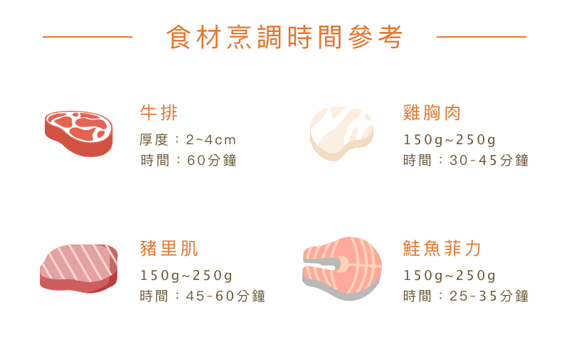 內建模式,料理新手也能做出美味料理,料理熟手,可依造喜好,微調烹飪時間,做出更多美食變化。