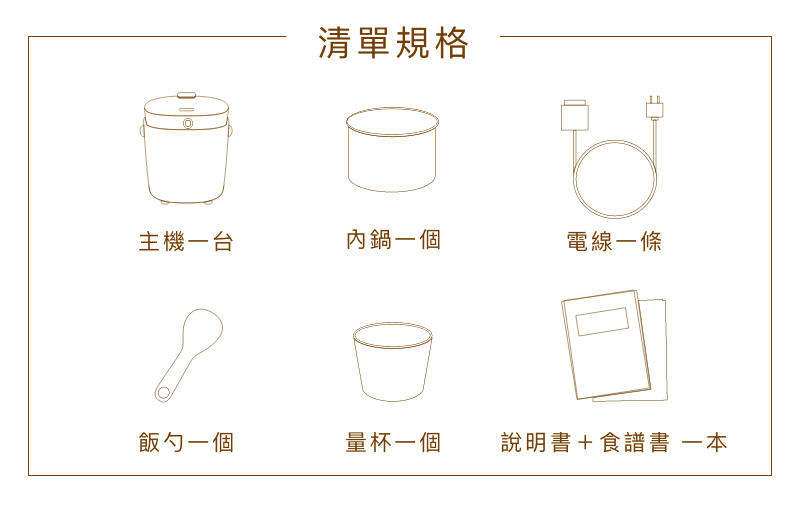 內容物:電子鍋主體、內鍋x1、飯勺、量杯、說明書、食譜書