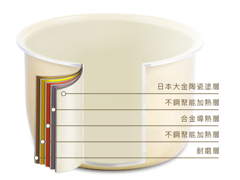 材質:內鍋 鋁合金 + 日本大金塗層/保溫蓋 304不鏽鋼 /蒸氣閥 PP 材質/保溫蓋密封圈、蒸氣孔密封圈 矽膠