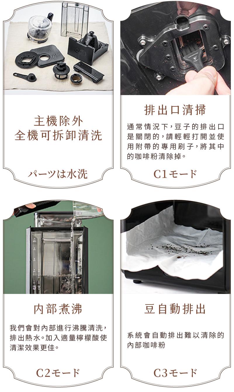 除了提供三種清潔模式,排出口清潔、內部清潔、咖啡粉排出之外,所有配件水箱、咖啡豆箱、濾網蓋、專用咖啡壺,也可拆卸清洗。
