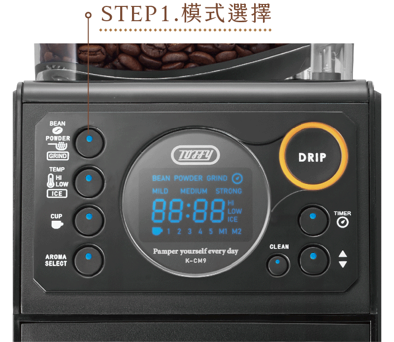 把適量咖啡豆/粉倒入盒中,只要五個步驟,依序選擇模式、溫度、杯數、濃度,按下烹煮鍵即開始濾煮!