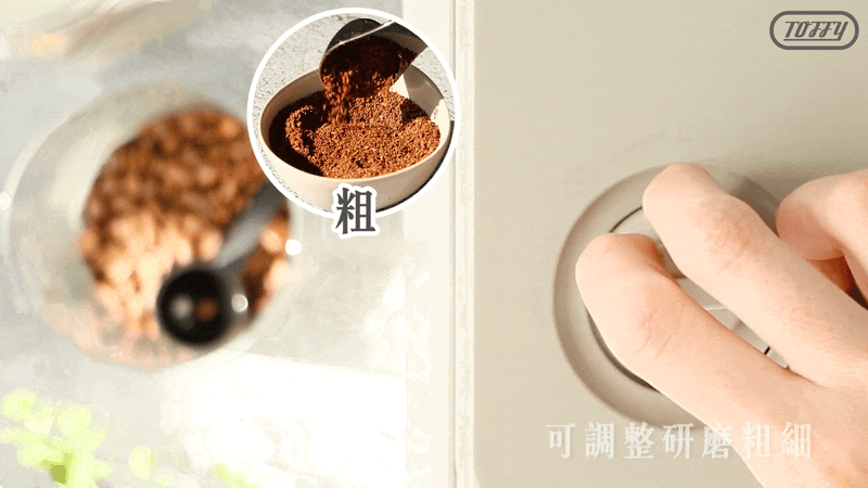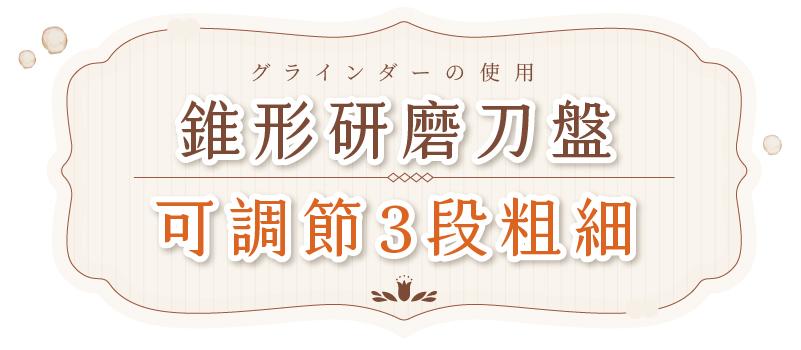 採用錐形研磨刀盤設計,產生的摩擦熱較少,能更均勻研磨咖啡豆,可根據沖煮需求調整三段粗、中、細顆度。