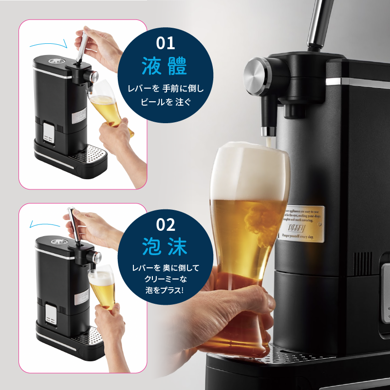 日本直立式免插電啤酒機,一秒 4 萬次超音波振動技術,創造濃密細緻泡沫,一次還可放入兩罐 350ml 罐裝或 500ml瓶裝啤酒,拉桿設計可自由切換,選擇液體/泡沫模式,單邊可出不同酒品,輕鬆在家打造居家酒吧!
