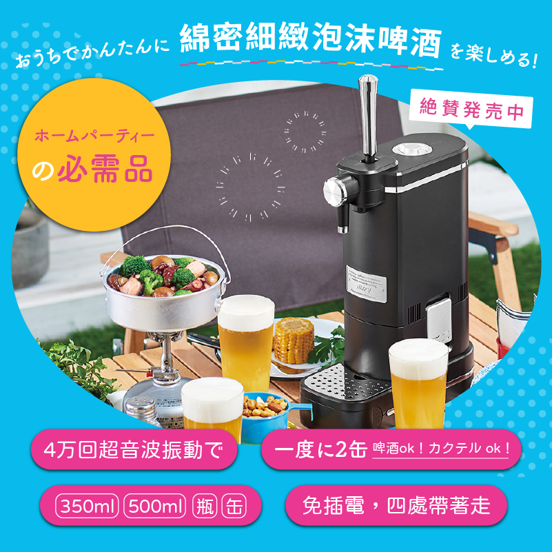 一秒 4 萬次超音波振動技術,打出更加持久極綿密的細緻酒泡,讓你隨時喝的到 7:3 黃金比例生啤口感啤酒。