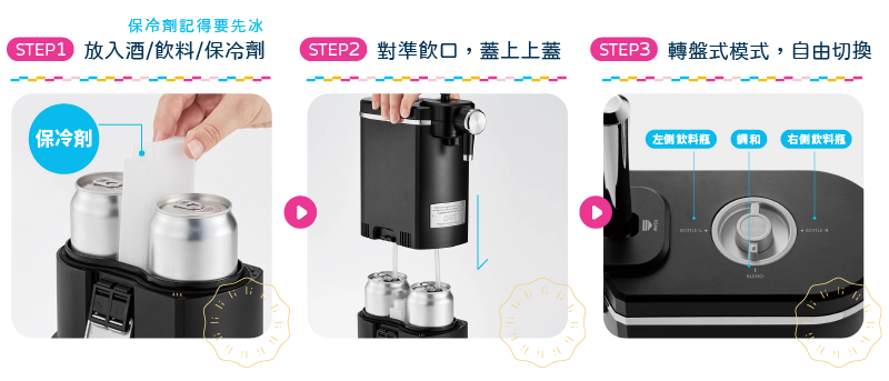 放入飲品、保冷劑,並闔上上蓋,自由切換不同模式,可單邊出不同酒品或相互調和。