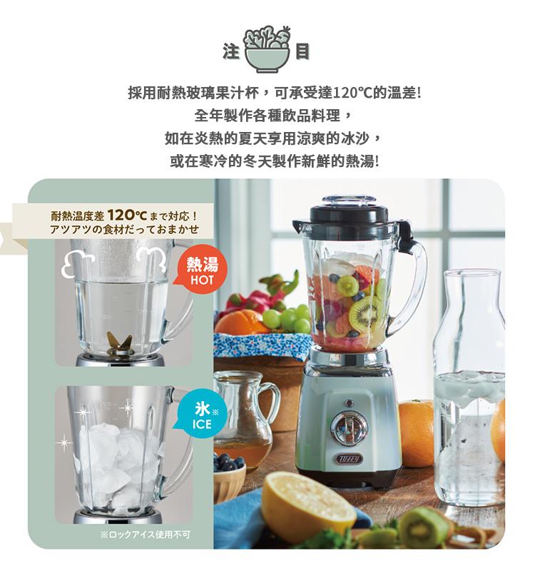 日本復古簡約設計,體型精緻小巧,大容量 600ml 果汁杯,適合 1-2 人小家庭使用,耐熱玻璃杯可以承受高達 120℃ 溫差,三種模式與堅韌的不銹鋼刀頭可以攪碎各類食材,不論是酷暑時想喝冰涼果汁,還是寒冬想來碗熱呼呼的濃湯,都可以輕鬆完成!