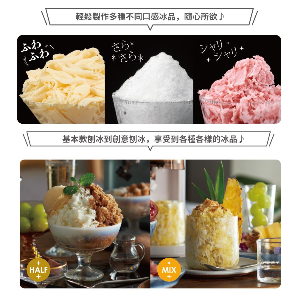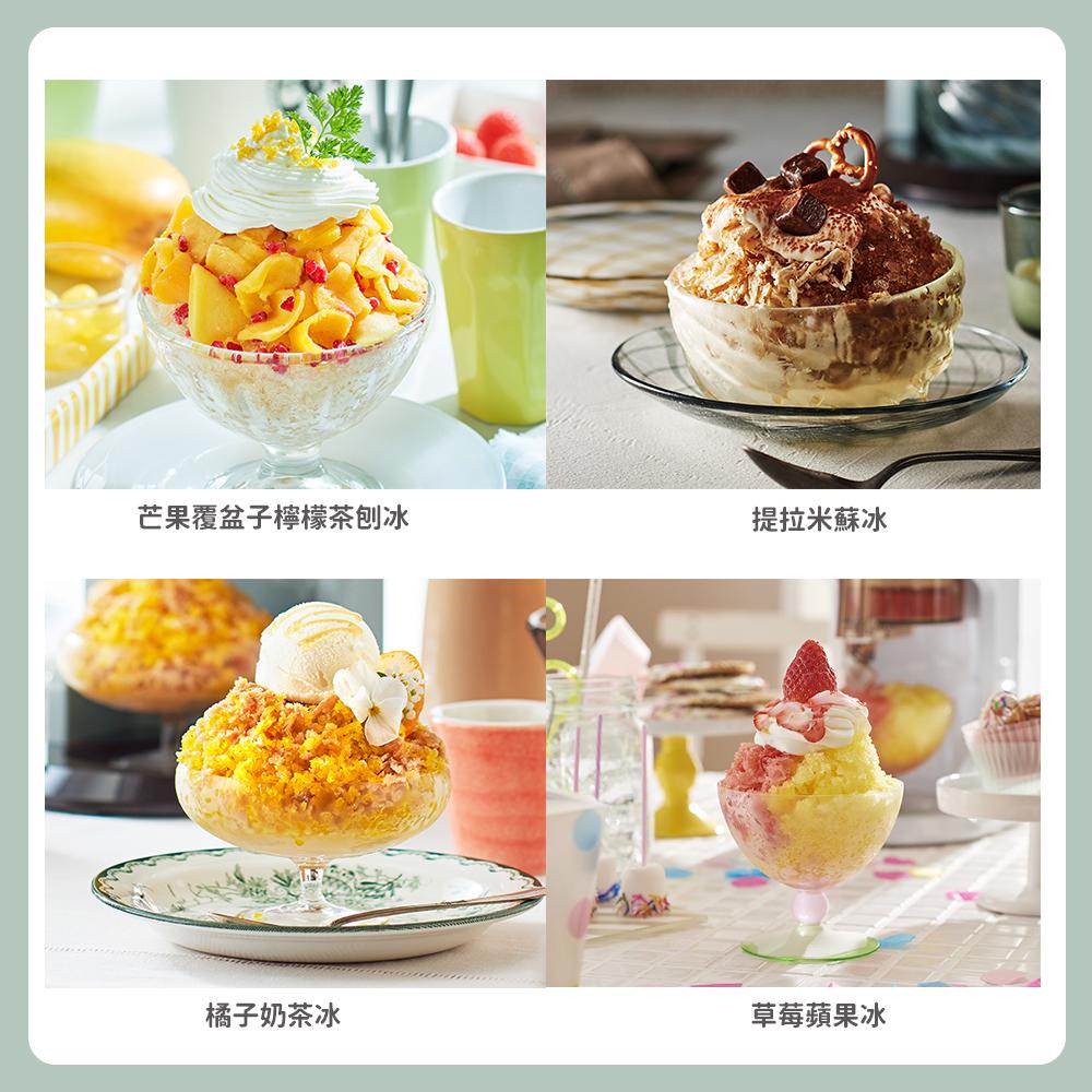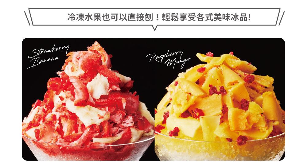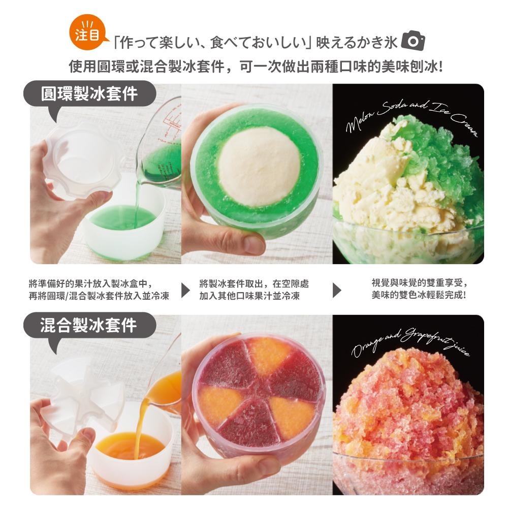 內容物:主機、刨冰盒、製冰盒x2、水果冰環、製冰套件(圓環製冰、混合製冰)