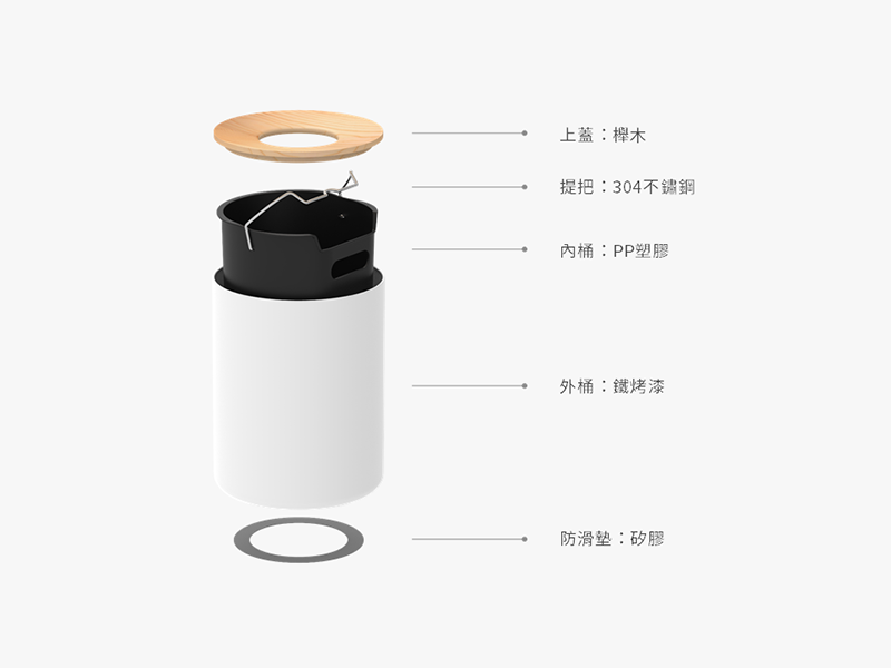 材質:上蓋 櫸木/內桶 PP 塑膠、304 不鏽鋼提把/外桶 鐵烤漆/防滑墊 矽膠