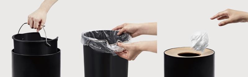分為內外二桶,內桶配備不鏽鋼提把,不論提取或置放都能輕鬆掌握;內提桶可隱蔽垃圾袋、後方開口則能收納飄落在外多餘的垃圾袋,闔上木蓋,垃圾桶不再只是環境清道夫,更成為了空間中的一大亮點!
