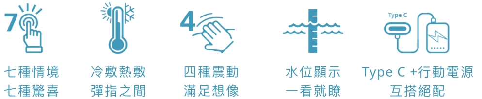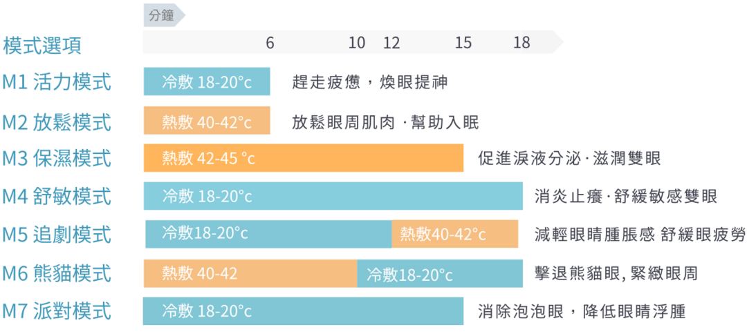 智能恆溫控制溫度,冷敷溫度 18~20°C,熱敷可達 42~45°C,七種預設模式可選擇。