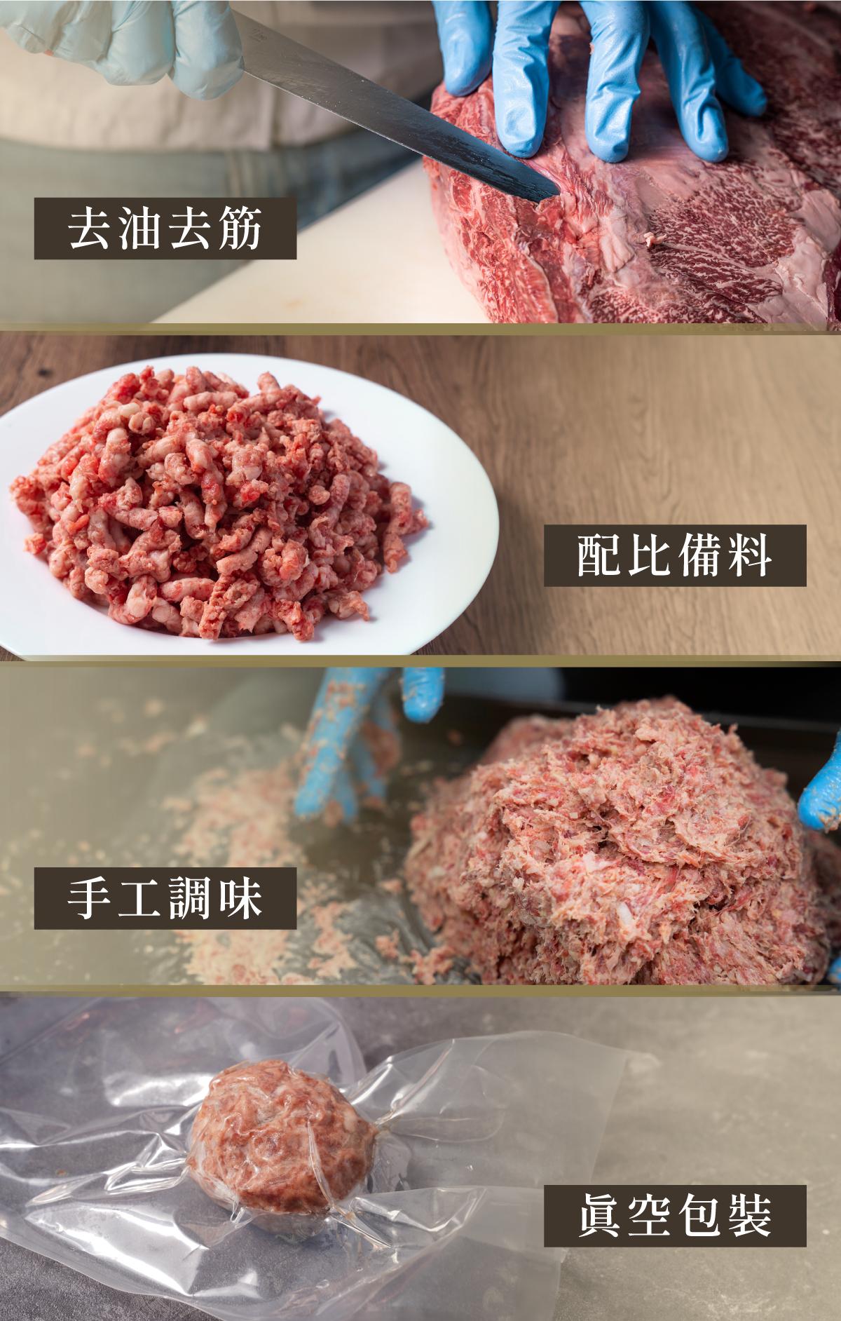 為了維持品質與口感,原料皆由人工細修處理,再依特定比例混合並調味,每一粒漢堡排都是近期揉製,冷凍真空包裝後進行配送,保證新鮮不囤貨。