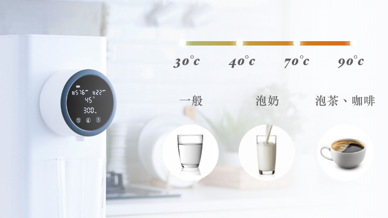 小白鯨有「常溫、45度、65度、80度、90度」多段溫控。早上起床喝杯 45 度溫水,喚醒腸胃;65 度沖泡可可、奶茶,溫熱好入口;90 度就能泡茶,還有救援宵夜泡麵。