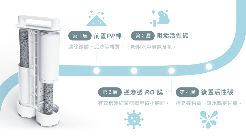 - RO純水濾芯,濾淨重金屬、病菌及氯