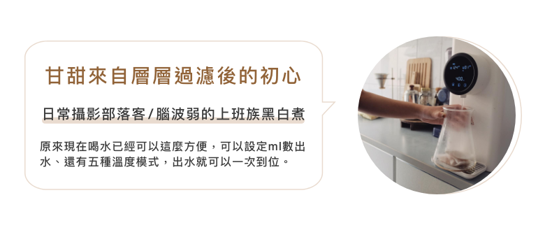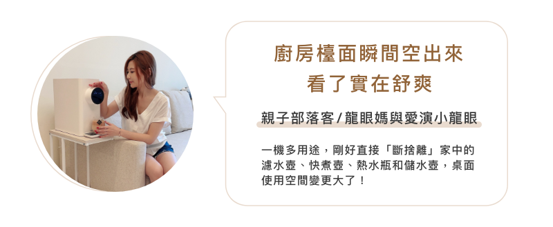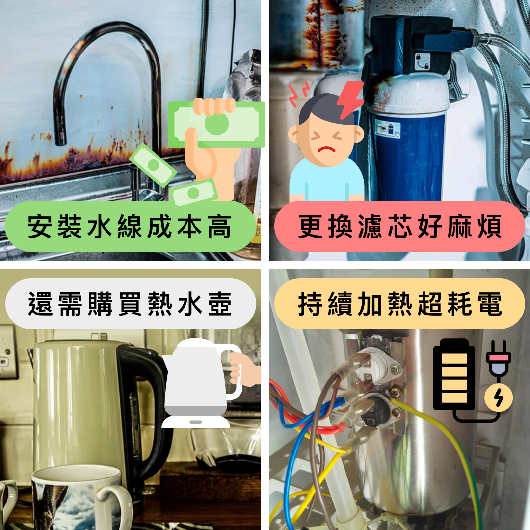 不用拉管線、鑽孔,只要能夠連接電源,就能放在任何地方。從常溫水到熱水,按一鍵就能馬上喝;自主更換濾芯的設計,不需約時間,自己動手就能換。更沒有電熱水瓶亞硝酸鹽殘留的問題。