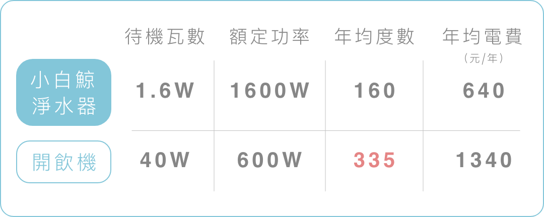 市售開飲機待機耗電量是小白鯨的 25 倍。小白鯨淨水器,平均一天只需要 2 元電費。相比傳統開飲機,電費省下近一半,花小錢就有好水喝。