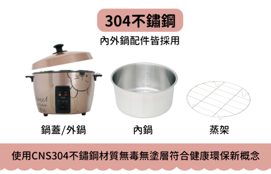 - 外鍋、內鍋、蒸盤皆 304 不鏽鋼材質